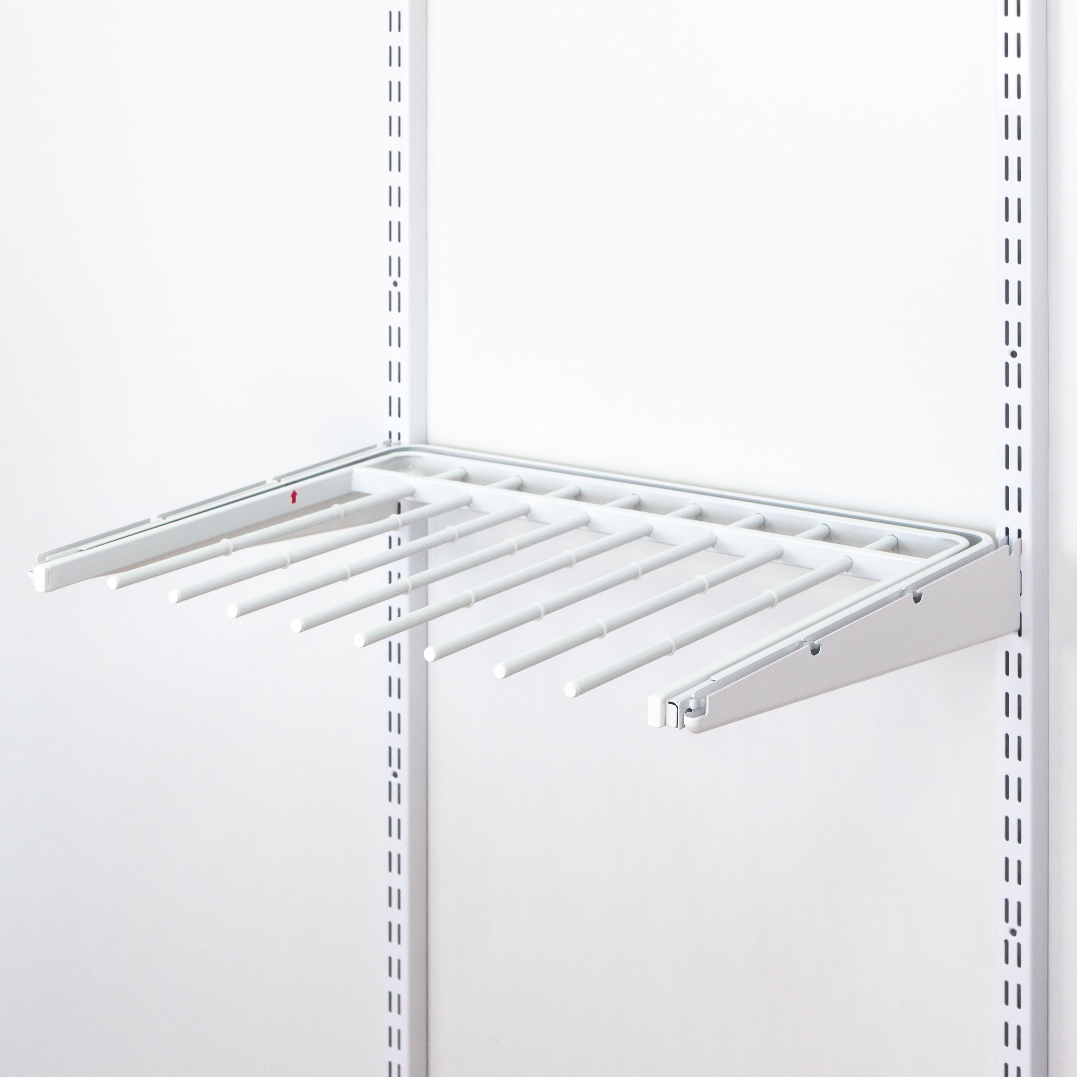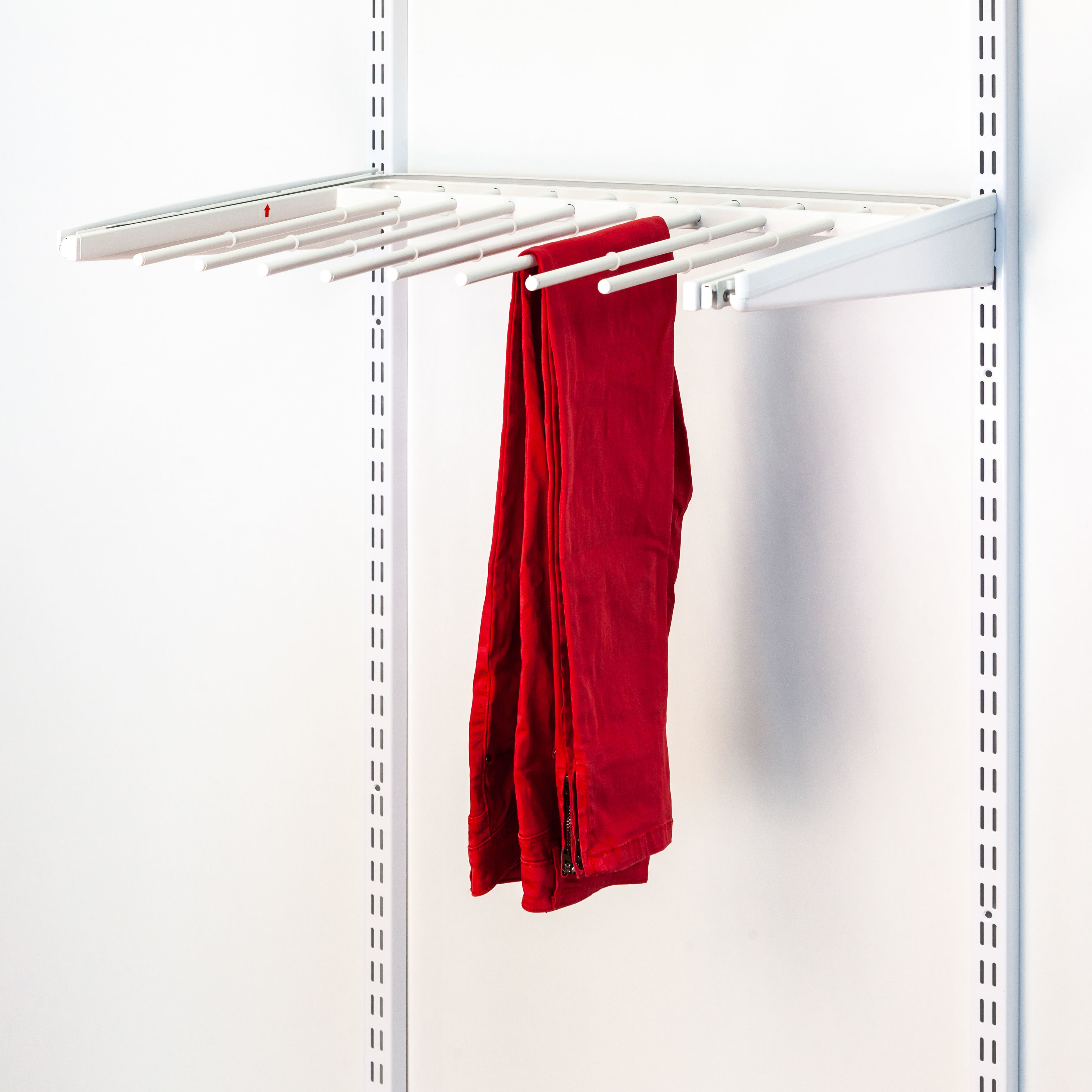 Выдвижная металлическая брючница Gardie. Устанавливается в кронштейны 420мм, дополнительные элементы для установки не требуются. Выдвижной механизм реализован с помощью роликов. Для корректной работы выдвижного механизма требуется расстояние 575мм между вертикальными направляющими. Брючница рассчитана для хранения до 8 пар брюк или джинс. На прутках имеются специальные противоскользящие силиконовые резинки. Брючница позволяет хранить ваши брюки в быстром доступе и не допустит формировании складок.