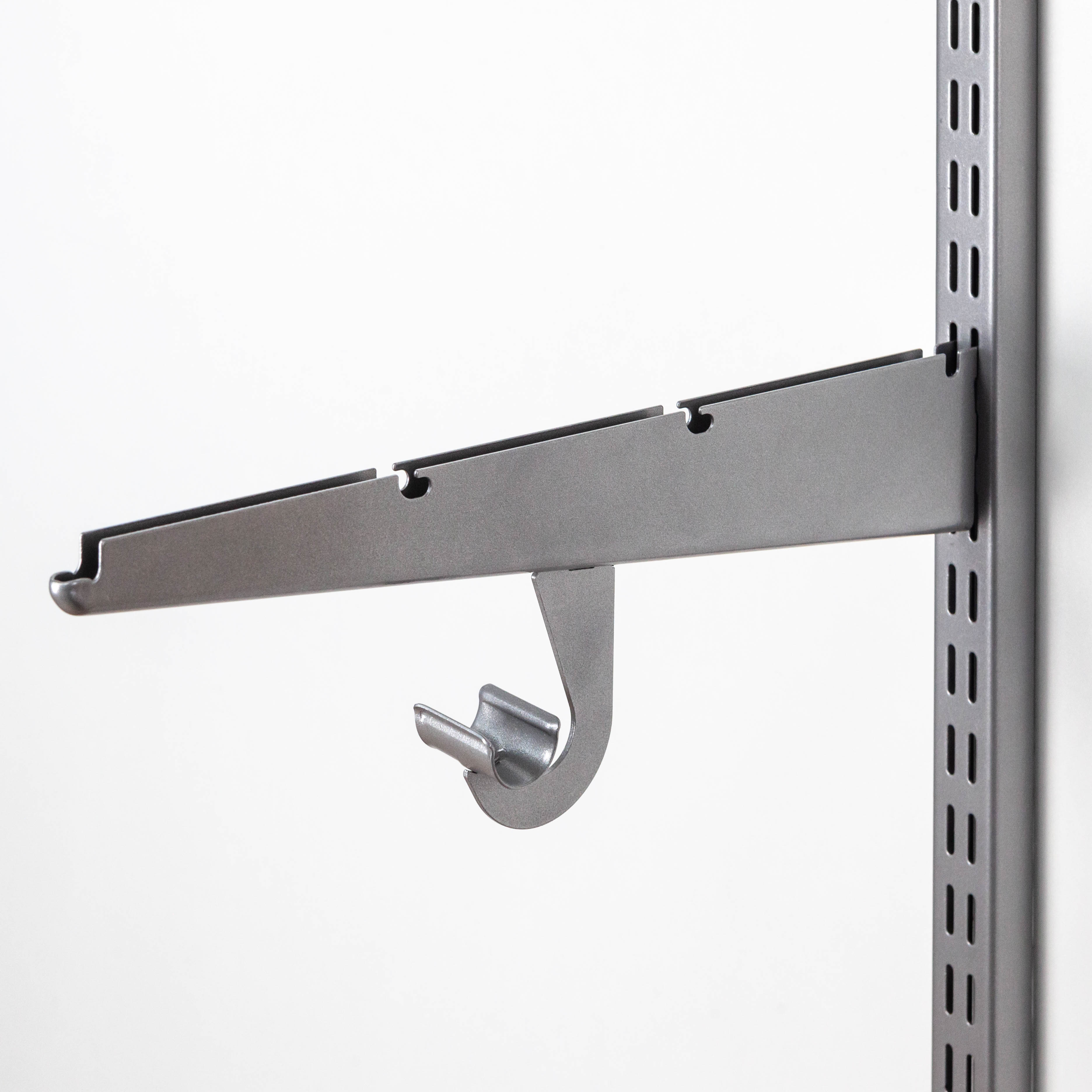 Крючок для штанги диметром 25мм. Устанавливается в специальные отверстия в нижней части кронштейнов 320мм, 420мм и 520мм. Расстояние от стены до крючка одинаковое 27см, независимо от глубины кронштейна. Элемент выполнен из стали и окрашен с использованием технологий нанесения полиэфирного порошкового покрытия.