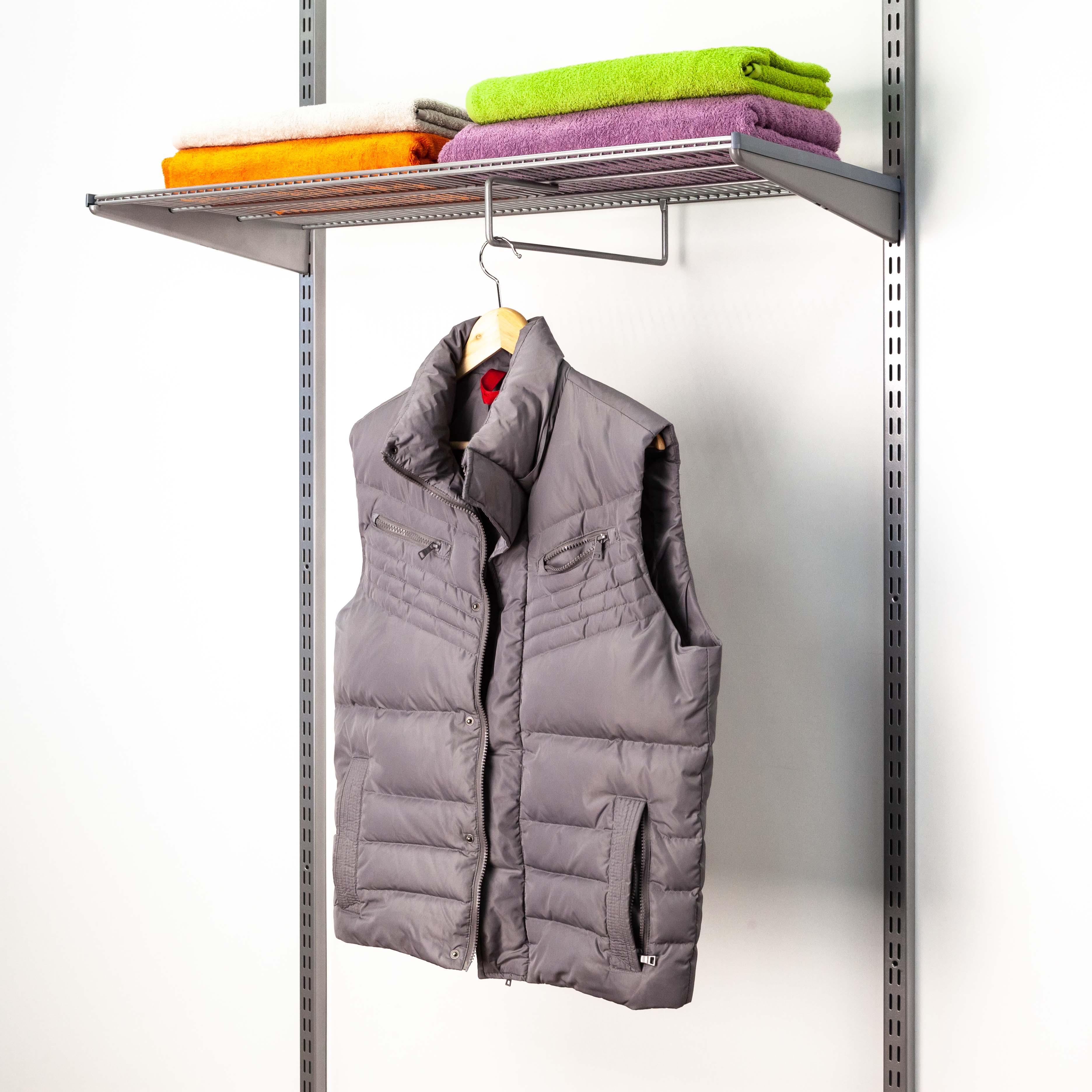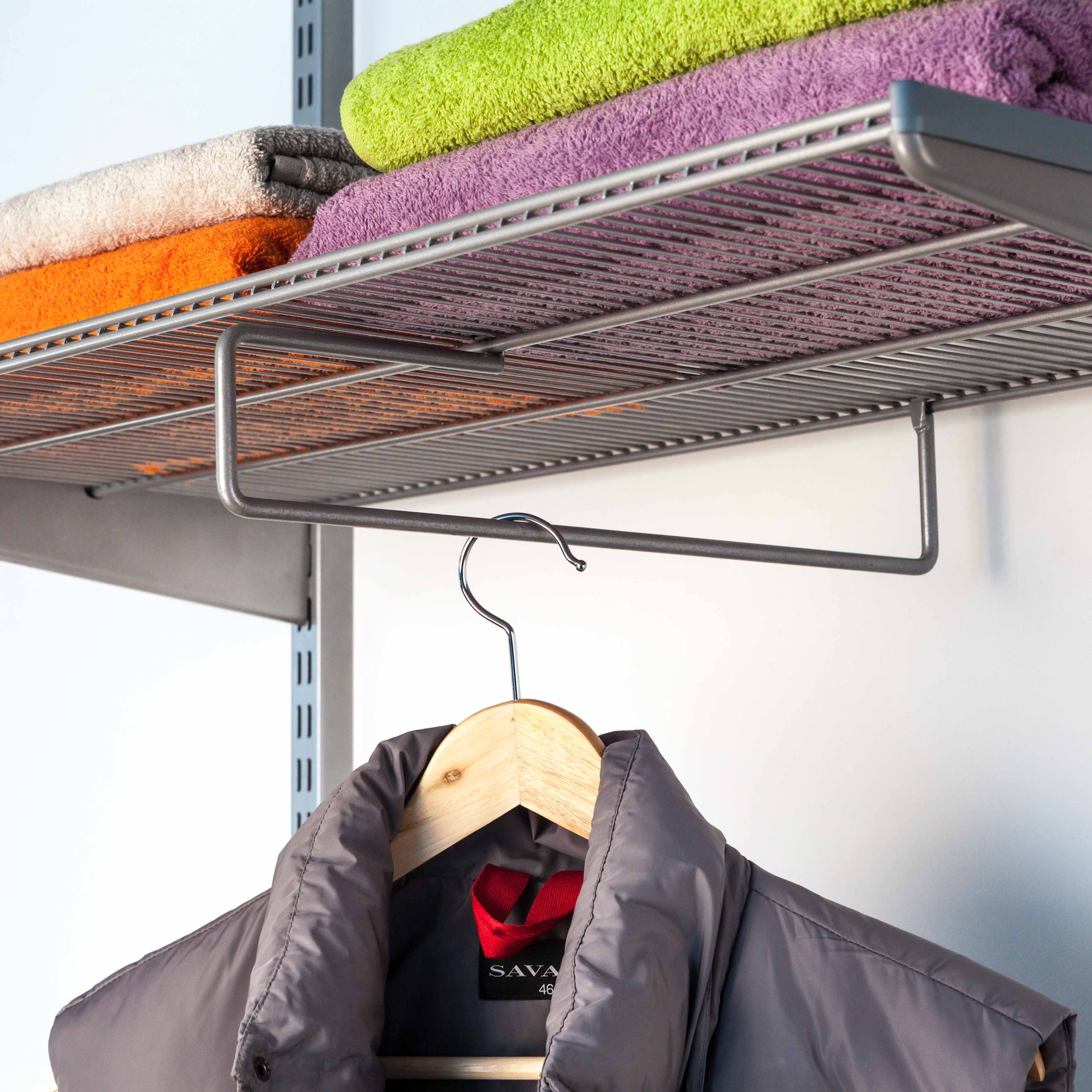 Подвес под проволочную полку 405 мм. для гардеробной системы Gardie. Устанавливается под проволочные полки 405х607мм, 405х900мм и 405х1212мм. Данный элемент может заменить штангу для одежды. Элемент изготовлен из стальной проволоки толщиной 6мм. Используется для хранения одежды на вешалках, зонтов.